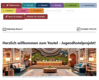 Die Digitalassistenz am Landesinstitut für Schulqualität und Lehrerbildung Sachsen-Anhalt (LISA) freut sich, für den Schuljahresbeginn 2025/2026 die Veröffentlichung des Selbstlernkurses „Wir bauen ein Jugendhotel“ anzukündigen. Der innovative Moodle-Kurs wurde gemeinsam mit Lehrkräften der Sekundarschule „Geschwister Scholl“ in Goldbeck entwickelt und wird ab August 2025 auch anderen Schulen und Lehrkräften als OER-Material frei zur Verfügung gestellt. Der Kurs bietet Schülerinnen und Schülern vielfältige Möglichkeiten, fachübergreifend Wissen zu erwerben und in einem praxisnahen, motivierenden Szenario zur Anwendung zu bringen. Für alle Schulen und Lehrkräfte frei nutz- und anpassbar, eignet sich der Moodle-Kurs für den Einsatz im Rahmen von Projektwochen, im Fachunterricht oder in Phasen selbstorganisierten Lernens, indem dieser Schülerinnen und Schüler einlädt, ein fiktives Jugendhotel von der Konzeption bis zur (virtuellen) Umsetzung eigenständig zu gestalten.